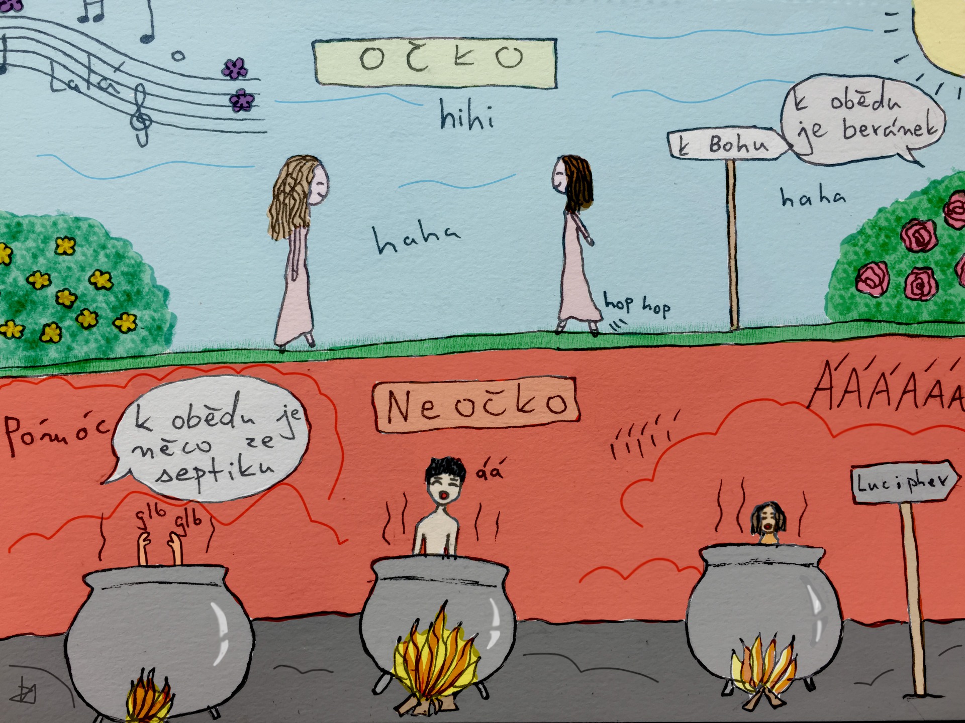 Sedíme na trávě, ve stínu pod stromy. Kousek od nás leží mrtvý holub. Kuba do něj zkouší píchat klackem, ale Bětka ho po chvíli okřikuje, ať má taky trochu úcty k mrtvému tvorovi. "To je jako kdybys dloubal do dědy."